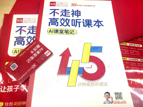 初中阶段是培养学习习惯的关键期,而专注力不足已成为影响学习效率的普遍问题。信息过载、多任务切换、情绪波动等因素,导致学生在课堂中频繁“掉线”。全品AI智慧教辅系列产品中——内容赋能型文具《全品不走神高校听课本》却从认知科学出发,设计“45分钟高效听课法”,通过视觉分区、节奏提示,帮助学生维持注意力周期。